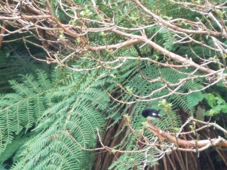 A fantail zooms by inches from my face and lands, on a branch just a few feet away, so close that I can clearly see it. For the next few seconds anyway.