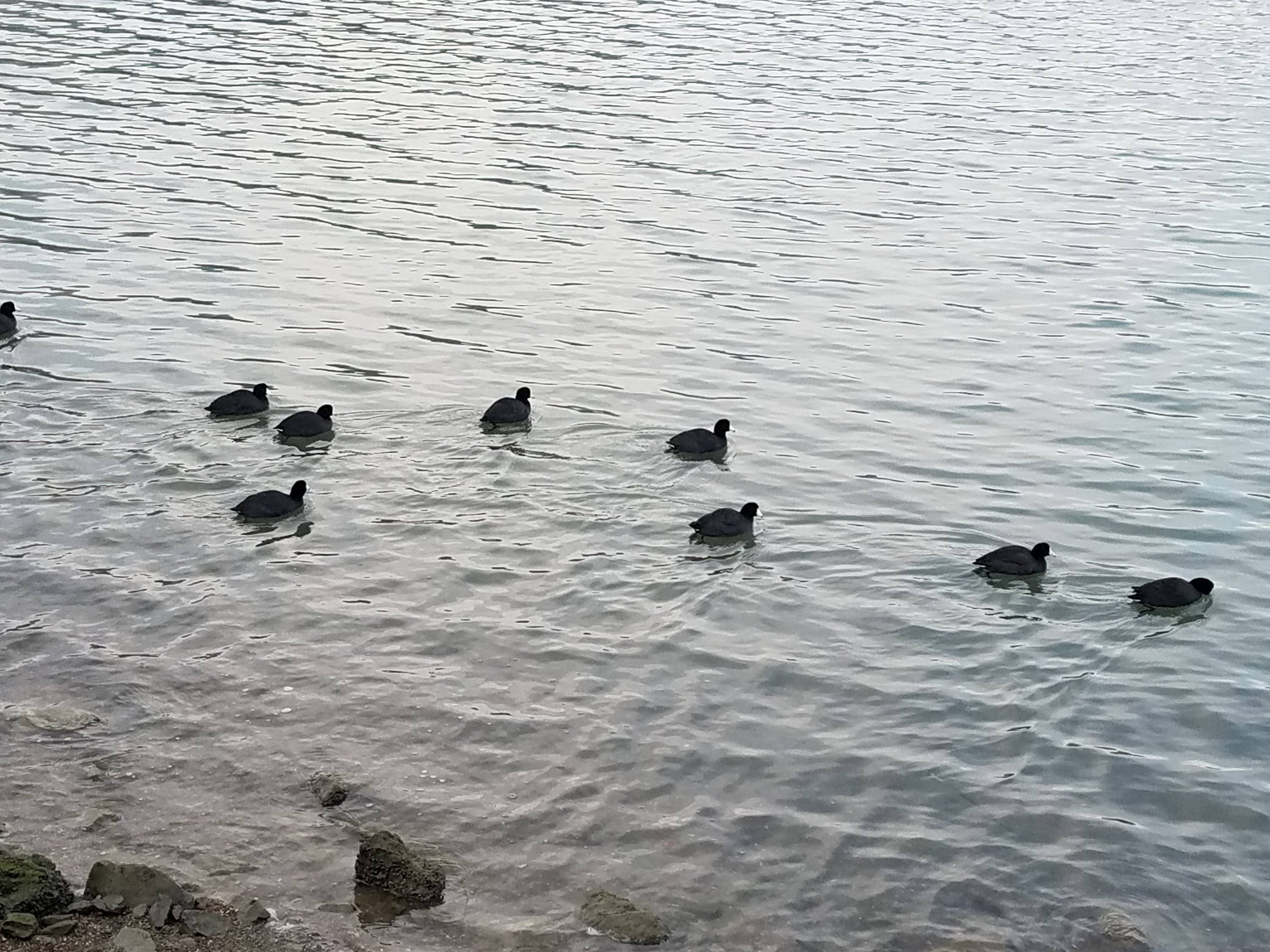 I stopped again by a little nook of the lagoon, because I saw a bunch of American coots on the shore. My presence alarmed the birds and they all got into the water, which looked picturesque, so here.