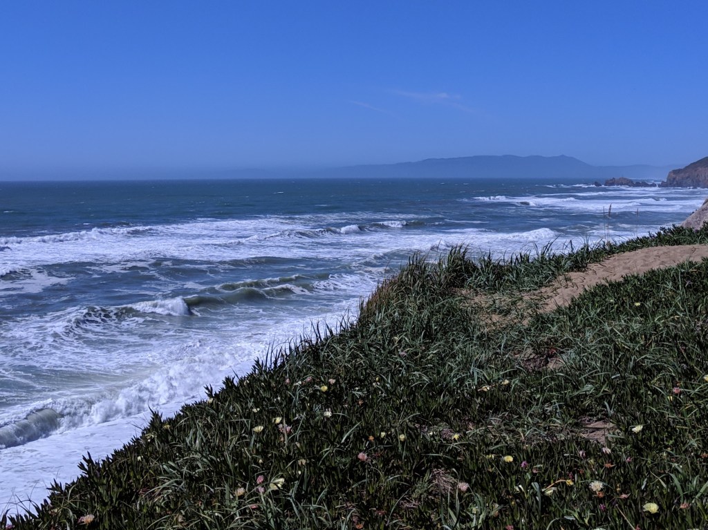 And – together, we finally made it to the beach in Pacifica. I tried that a few times before. The first time it was raining, I got lost, and it just wasn’t fun any more, so I turned around. The second time, it was a lovely day, and I technically made it, but not quite as far, because I was rushed, so I turned around and lost my phone somewhere in the process. The third time, the official training ride route skirted Pacifica on the way to Woodside but didn’t stop there. The fourth time was a charm!