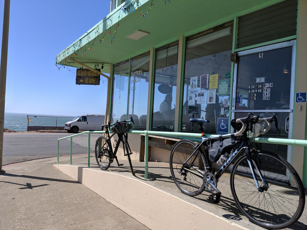 I mapped the route out to the Chit-chat cafe in Pacifica, because if I learned anything from my official training ride that was the importance of well planned rest stops with snacks and bathrooms! Besides, I was there once before, on another Sunday two years ago, during the time of heart break, lazy Sundays, and yoga brunches, with Laura and Miss Sable, and that was just such a lovely afternoon! I had the best memories of that little area and was glad to revisit. When Cameron and I got to the cafe, there was a couple playing live music and a few patrons, even nicer than I planned: like catching a glimpse of another life. We sat at the cafe with our warm drinks and then went to sit by the ocean for a few minutes.