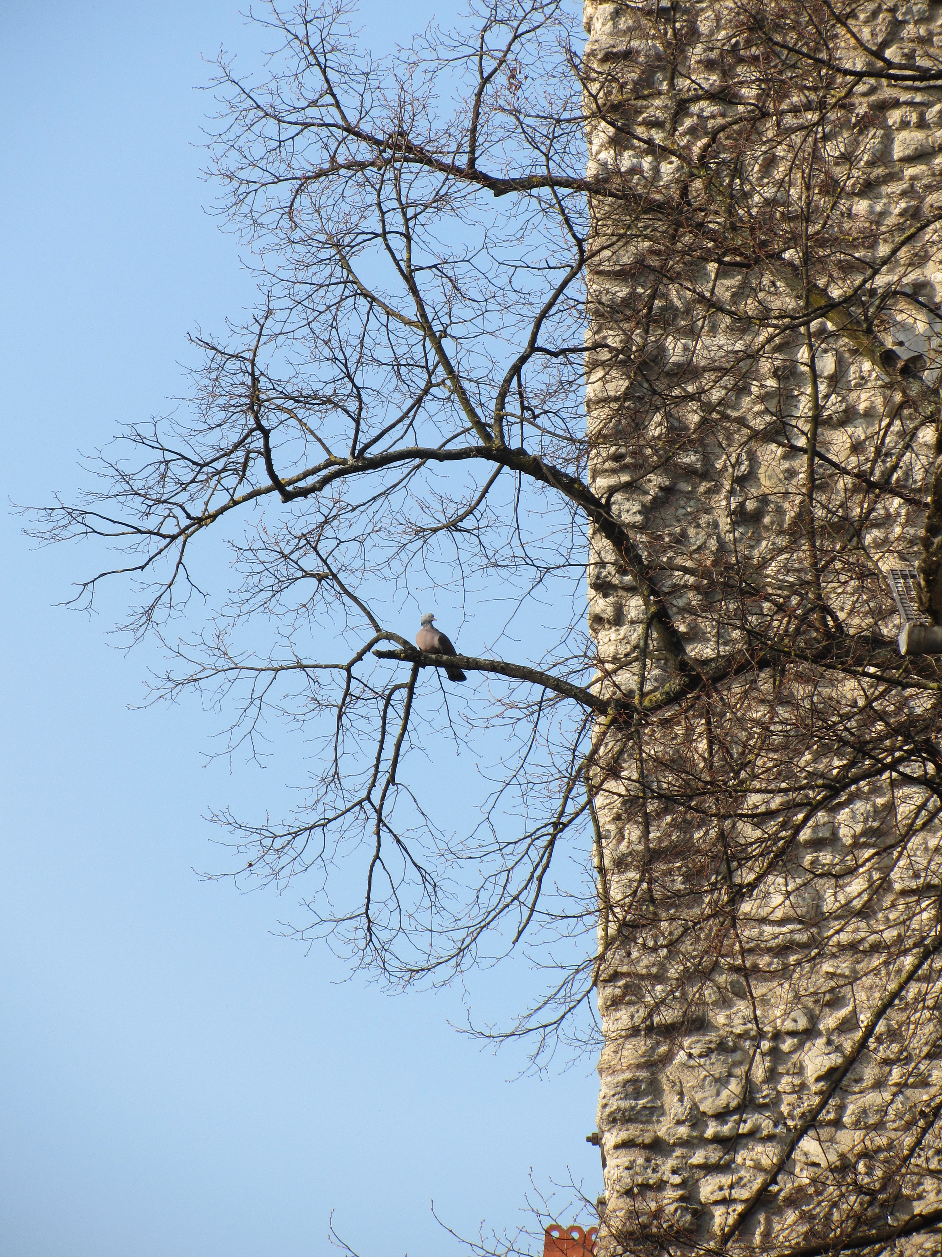 The man-made wall is (presumably) ancient, solid, dead. The tree, the sky, the bird are light and transient.