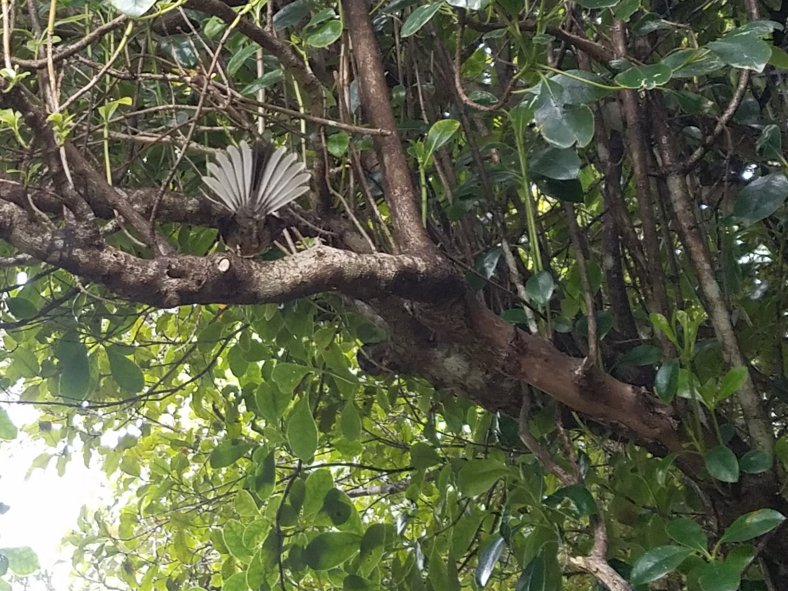 A fantail zooms by inches from my face and lands, on a branch just a few feet away, so close that I can clearly see it. For the next few seconds anyway.